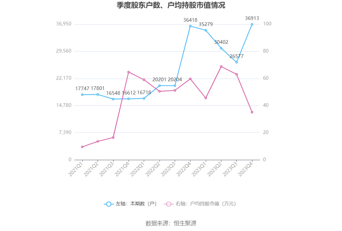 筹码集中度方面,截至2023年年末,公司股东总户数为3.69万户,较三季度末增长了1.03万户,增幅38.89%;户均持股市值由三季度末的63.02万元下降至35.12万元,降幅为44.27%。