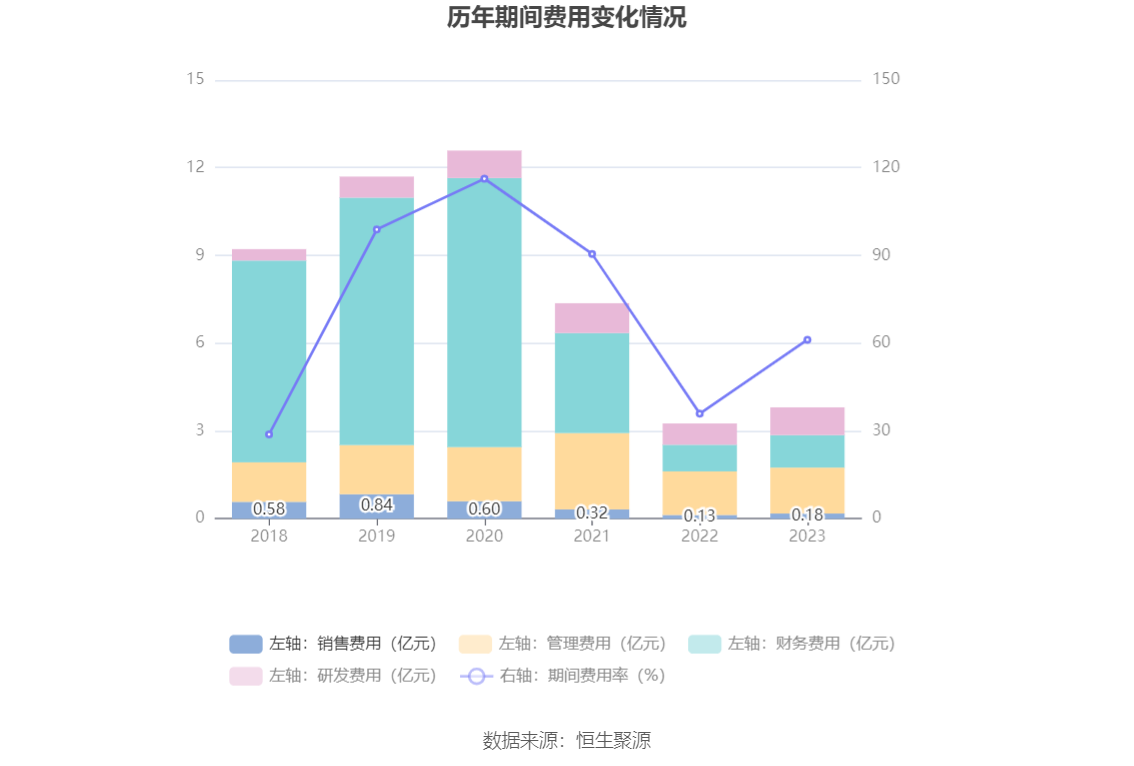 2023年,公司期间费用为3.81亿元,较上年同期增加5558.22万元;期间费用率为61.21%,较上年同期上升25.28个百分点。其中,销售费用同比增长38.26%,管理费用同比增长5.51%,研发费用同比增长30.53%,财务费用同比增长22.24%。
