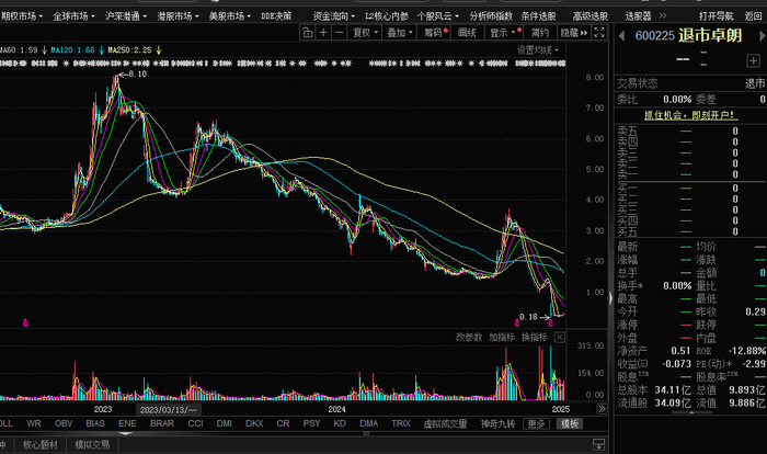 监管调查数据还显示,该造假行为造成的财务失真规模惊人:2019年至2023年,退市卓朗年度报告分别虚增营业收入2.49亿元、4.89亿元、3.39亿元、6.56亿元、0.82亿元,占各期披露营业收入比例最高达72.46%;同期虚增利润总额分别为2.49亿元、3.10亿元、3.39亿元、3.57亿元、0.82亿元,占各期披露利润总额绝对值比例最高达86.08%。此外,证监会还查明,退市卓朗2019年至2020年期间存在未按规定披露4.91亿元对外担保的重大遗漏问题,相关行为已触及重大违法强制退市情形,公司已于2025年3月6日正式摘牌。