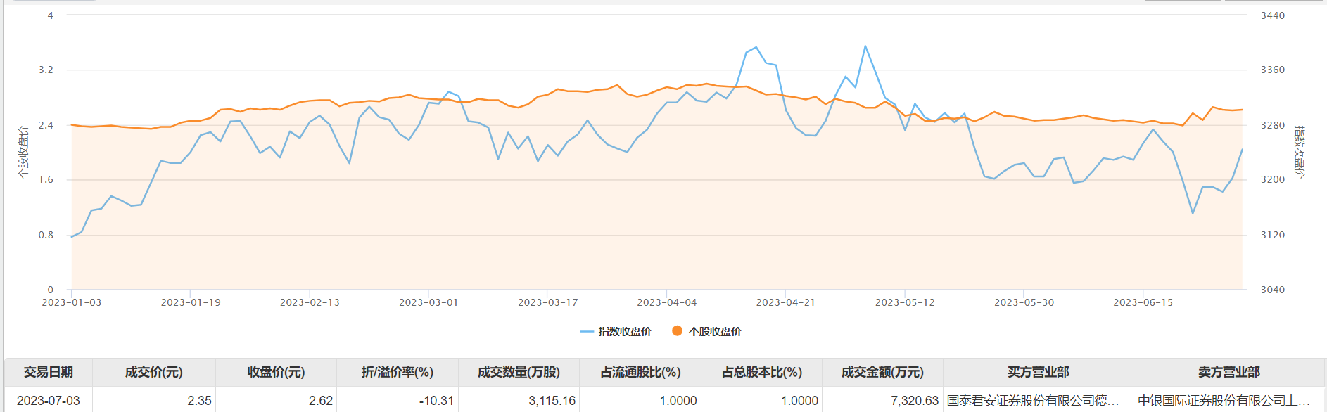 7月3日大宗交易成交3115.16万股,成交额7320.63万元,占当日总成交额的66.07%,成交价2.35元,较市场收盘价2.62元折价10.31%。
