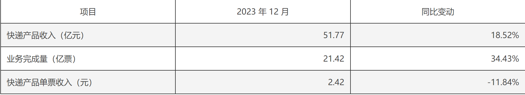 1月19日公告,公司2023年12月快递产品收入51.77亿元,同比上涨18.52%。