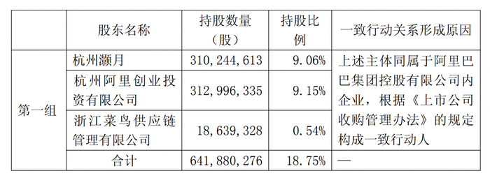 此次减持前,杭州灏月持股9.06%,杭州阿里创业投资有限公司持股9.15%,浙江菜鸟供应链管理有限公司持股0.54%,一共持股为18.75%。