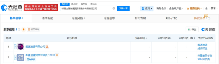 雷达财经讯,天眼查工商信息显示,近日,新疆边疆瑞通贸贸易服务有限责任公司成立,法定代表人为马景峰,注册资本1000万人民币,经营范围包括国内贸易代理、进出口代理、国际货物运输代理等。股东信息显示,该公司由圆通速递有限公司、新疆边疆宾馆有限责任公司共同持股。