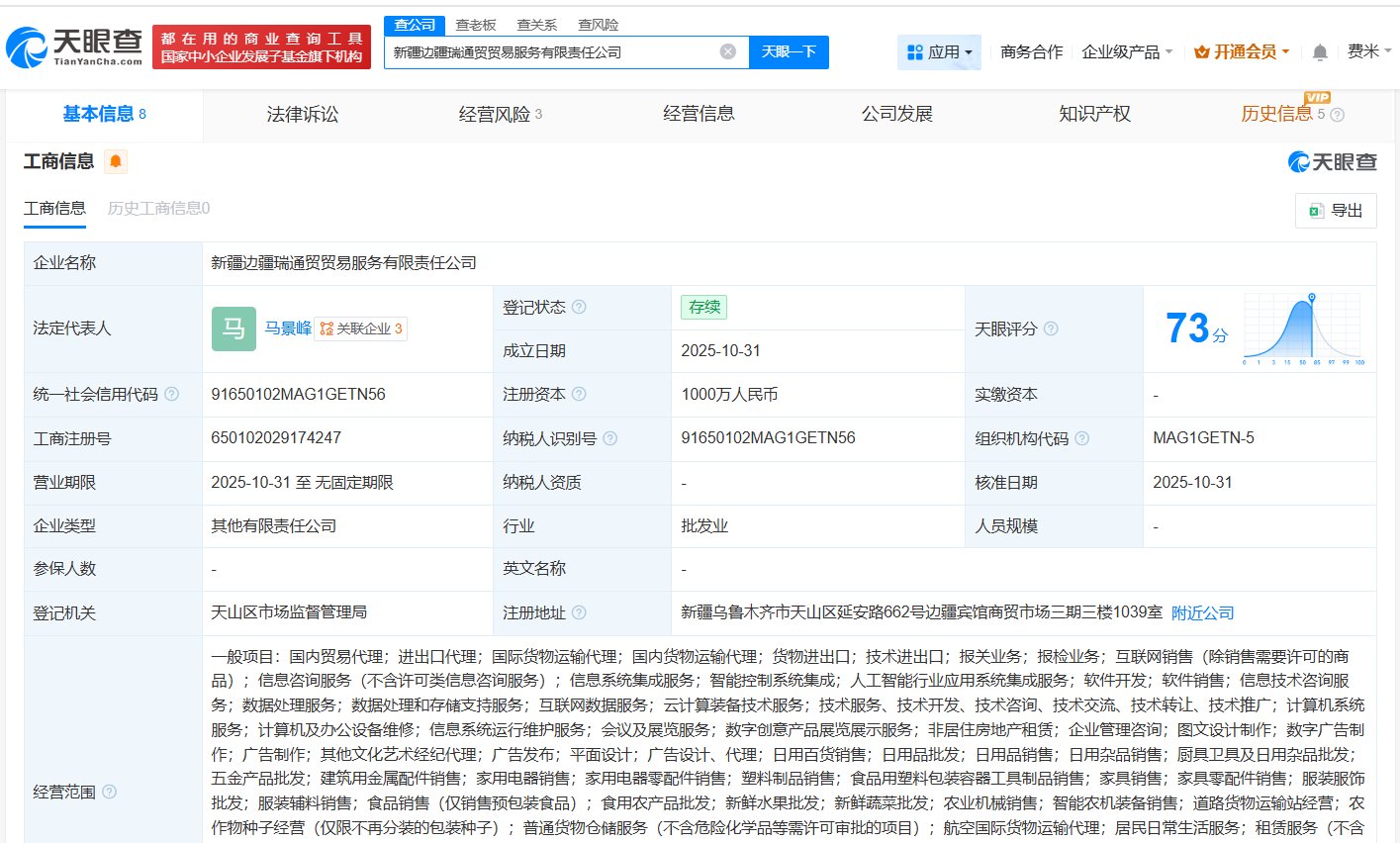 每经AI快讯,天眼查工商信息显示,近日,新疆边疆瑞通贸贸易服务有限责任公司成立,法定代表人为马景峰,注册资本1000万元人民币,经营范围包括国内贸易代理、进出口代理、国际货物运输代理等。股东信息显示,该公司由圆通速递有限公司、新疆边疆宾馆有限责任公司共同持股。
