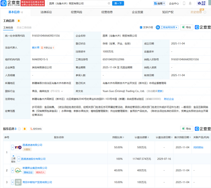 企查查APP显示,近日,圆果(乌鲁木齐)商贸有限公司成立,法定代表人为戴长青,注册资本1000万元,经营范围包含:水果种植;新鲜水果批发;植物园管理服务;供应链管理服务;食用农产品批发等。企查查股权穿透显示,该公司由圆通速递(600233)全资子公司圆通速递有限公司、新疆果业集团有限公司等共同持股。