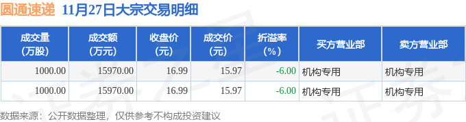 证券之星消息,11月27日圆通速递发生大宗交易,交易数据如下: