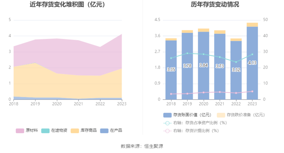 从存货变动来看,截至2023年末,公司存货账面价值为4.13亿元,占净资产的28.47%,较上年末增加8074.71万元。其中,存货跌价准备为2235.98万元,计提比例为5.14%。