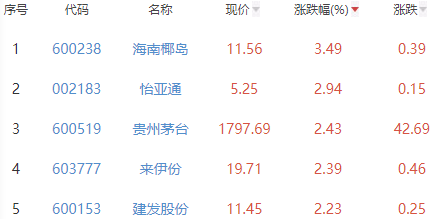 其中,海南椰岛、怡亚通、贵州茅台、来伊份和建发股份位列板块涨幅前五位,涨幅分别为3.49%、2.94%、2.43%、2.39%和2.23%。