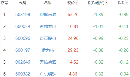 迎驾贡酒、古越龙山、岩石股份、伊力特、天佑德酒和广东明珠位列涨幅榜后五位,涨幅分别为-1.39%、-1.01%、-0.99%、-0.88%、-0.82%和-0.82%。