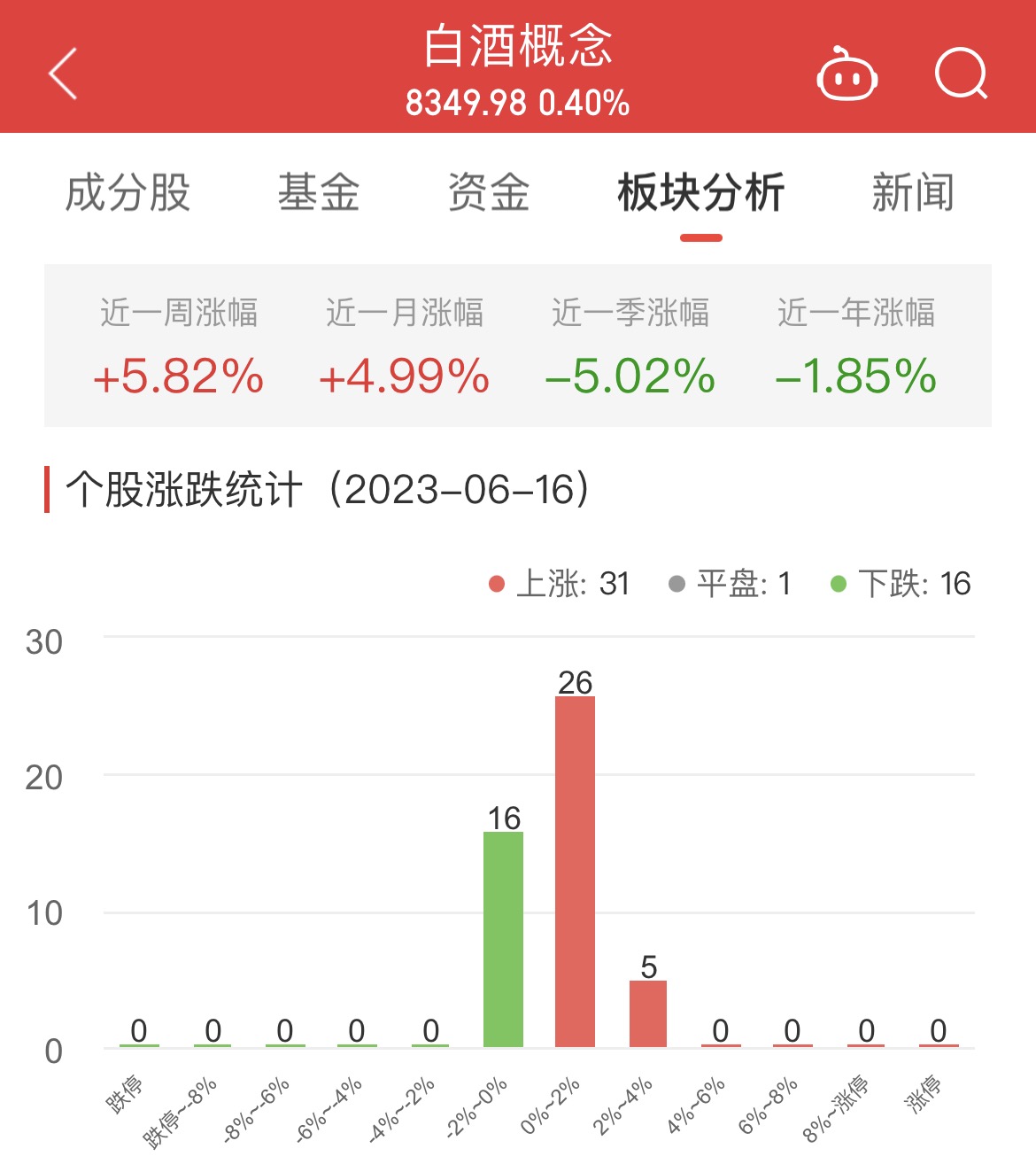中国经济网北京6月16日讯今日,白酒概念板块整体涨幅0.40%,其中31只股票上涨,1只股票平盘,16只股票下跌。