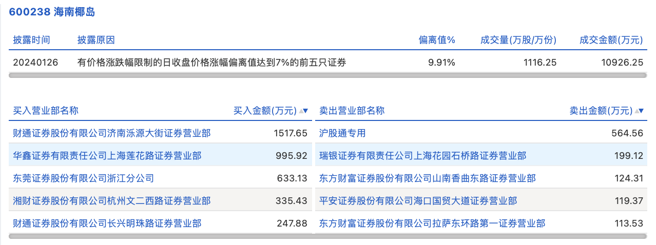 1月26日,海南椰岛今日涨停,全天换手率达2.51%,振幅达9.95%。龙虎榜数据显示,营业部席位合计净买入2609.12万元。其中,财通证券济南泺源大街证券营业部、华鑫证券上海莲花路证券营业部分别买入1517.65万元、995.92万元;沪股通专用、瑞银证券上海花园石桥路证券营业部分别卖出564.56万元、199.12万元。