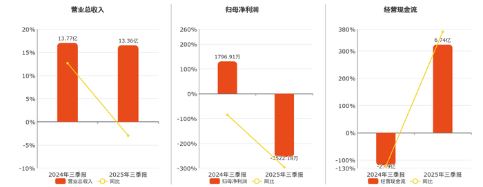 公司营业总收入为13.36亿元,较去年同报告期营业总收入减少4086.18万元,同比较去年同期下降2.97%。归母净利润为-3522.18万元,较去年同报告期归母净利润减少5319.08万元,同比较去年同期下降296.01%。经营活动现金净流入为6.74亿元,较去年同报告期经营活动现金净流入增加9.23亿元。