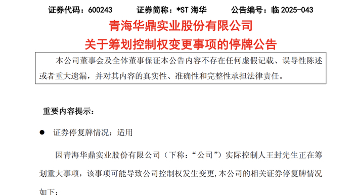 10月10日晚间,*ST海华(600243)公告称,公司实际控制人王封正在筹划重大事项,该事项可能导致公司控制权发生变更。