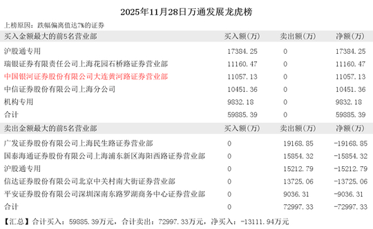 卖出前5席为:广发证券股份有限公司上海民生路证券营业部、国泰海通证券股份有限公司上海浦东新区海阳西路证券营业部、沪股通专用、信达证券股份有限公司北京中关村南大街证券营业部、平安证券股份有限公司深圳深南东路罗湖商务中心证券营业部。共计买入:0万元,共计卖出:72997.33万元。