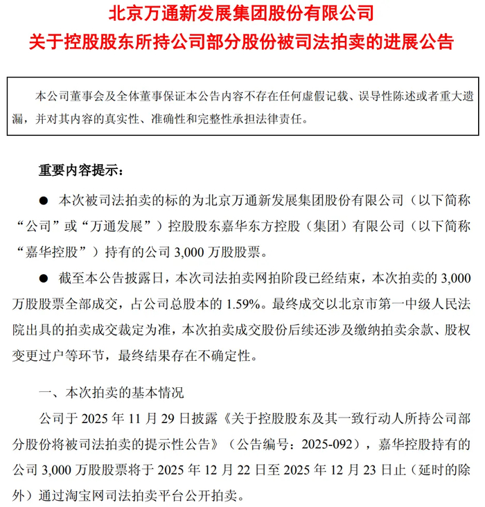 实际上,万通发展控股股东嘉华控股及其一致行动人持有的公司股份已有部分进入司法拍卖程序。万通发展于12月23日晚间披露的最新公告显示,嘉华控股持有的公司3000万股股票司法拍卖网络竞价阶段已结束,股份全部成交。此次拍卖的股份占公司总股本的1.59%。根据淘宝网司法拍卖平台公示信息,竞买人简江以11.33元/股价格竞得300万股,成交金额为3399万元;竞买人沈臻宇以11.32元/股价格竞得2700万股,成交金额为3.0564亿元。公司提示,本次拍卖最终成交需以北京市第一中级人民法院出具拍卖成交裁定为准,后续还涉及缴纳余款、股权过户等环节,结果尚存在不确定性。