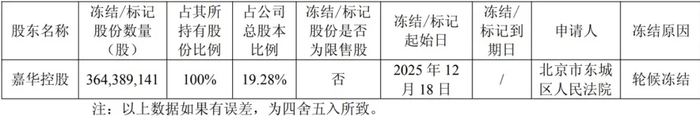 最新消息显示,2025年12月21日,万通发展收到控股股东嘉华控股来函告知,其所持的全部公司股份被轮候冻结,数量达3.64亿股,占公司总股本的19.28%。