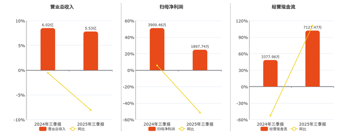 公司营业总收入为5.53亿元,在已披露的同业公司中排名第6,较去年同报告期营业总收入减少4855.60万元,同比较去年同期下降8.07%。归母净利润为1897.74万元,在已披露的同业公司中排名第5,较去年同报告期归母净利润减少2011.72万元,同比较去年同期下降51.46%。经营活动现金净流入为7121.47万元,在已披露的同业公司中排名第4,较去年同报告期经营活动现金净流入增加3743.51万元,同比较去年同期上涨110.82%。