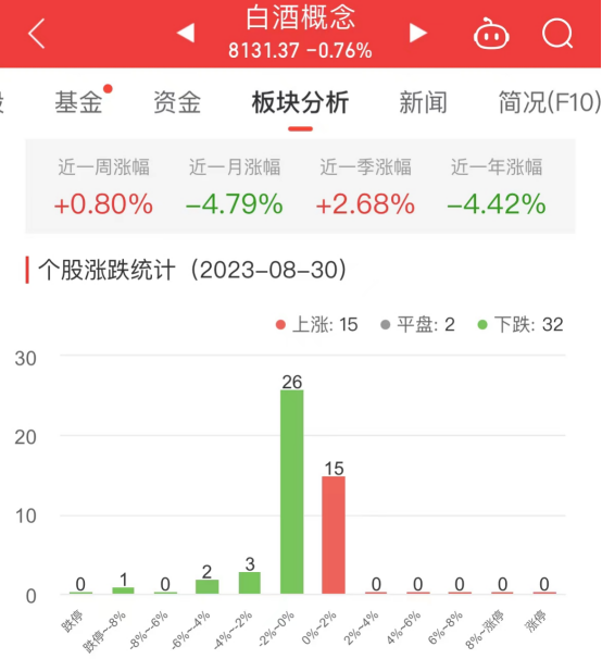 中国经济网北京8月30日讯今日,白酒概念板块整体跌幅0.76%,其中15只股票上涨,2只股票平盘,32只股票下跌。