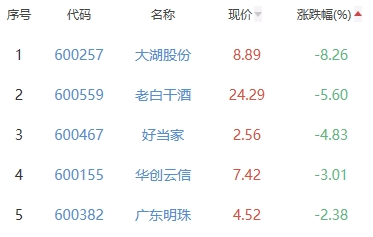 大湖股份、老白干酒、好当家、华创云信、广东明珠位列涨幅榜后五位,涨幅分别为-8.26%、-5.60%、-4.83%、-3.01%、-2.38%。