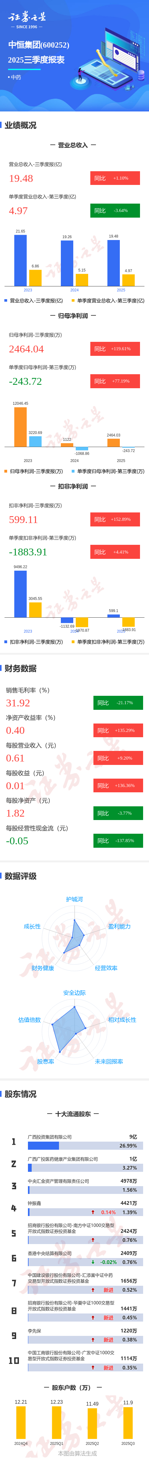 证券之星消息,中恒集团2025年三季报显示,前三季度公司主营收入19.48亿元,同比上升1.1%;归母净利润2464.04万元,同比上升119.61%;扣非净利润599.11万元,同比上升152.89%;其中2025年第三季度,公司单季度主营收入4.97亿元,同比下降3.65%;单季度归母净利润-243.72万元,同比上升77.2%;单季度扣非净利润-1883.91万元,同比上升4.41%;负债率34.36%,投资收益2796.13万元,财务费用-3484.16万元,毛利率31.92%。