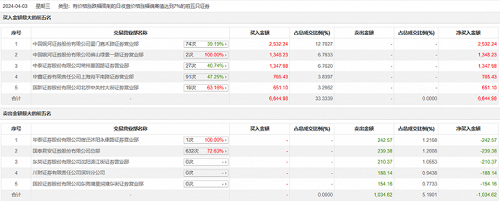 鑫科材料4月3日涨停,龙虎榜数据显示,上榜营业部席位全天成交7679.61万元,占当日总成交金额比例为38.52%。其中,买入金额为6644.98万元,卖出金额为1034.62万元,合计净买入5610.36万元。