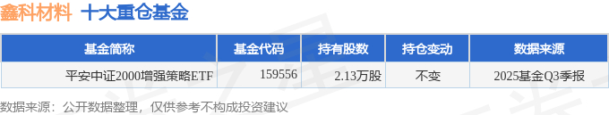 持有鑫科材料最多的基金为平安中证2000增强策略ETF,目前规模为0.22亿元,最新净值1.1699(10月30日),较上一交易日下跌1.37%,近一年上涨30.82%。该基金现任基金经理为李严。
