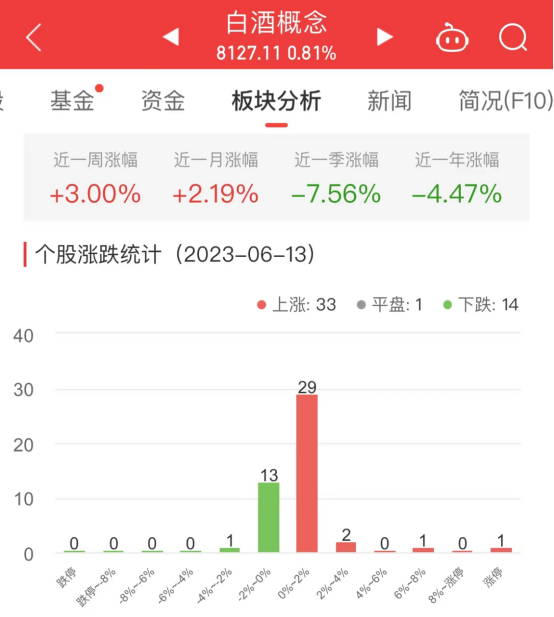中国经济网北京6月13日讯今日,白酒概念板块整体涨幅0.81%,其中33只股票上涨,1只股票平盘,14只股票下跌。