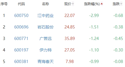 江中药业、岩石股份、广誉远、伊力特、青海春天位列涨幅榜后五位,涨幅分别为-2.99%、-1.51%、-1.24%、-1.10%、-0.99%。
