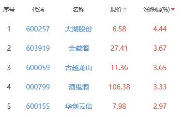 其中,大湖股份、金徽酒、古越龙山、酒鬼酒、华创云信位列板块涨幅前五位,涨幅分别为4.44%、3.67%、3.65%、3.33%、2.97%。