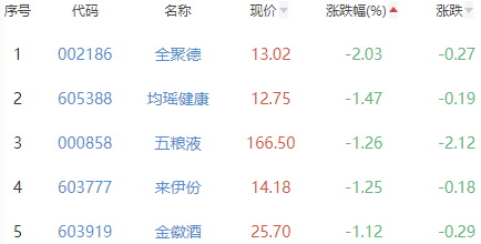 全聚德、均瑶健康、五粮液、来伊份和金徽酒位列涨幅榜后五位,涨幅分别为-2.03%、-1.47%、-1.26%、-1.25%和-1.12%。