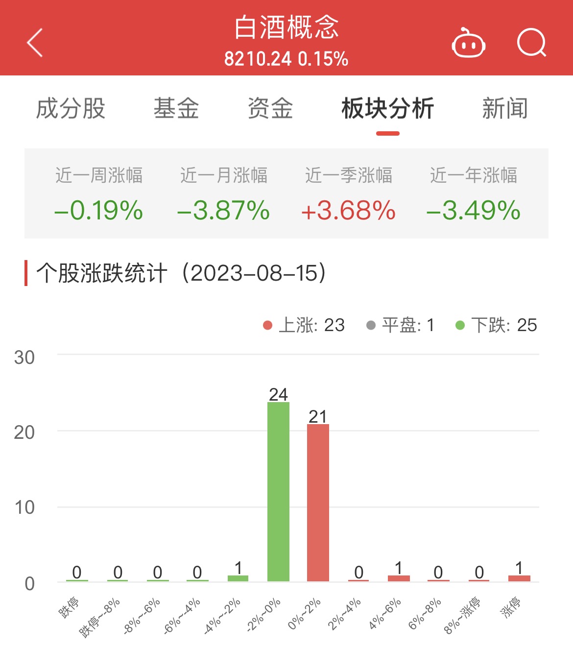 中国经济网北京8月15日讯今日,白酒概念板块整体涨幅0.15%,其中23只股票上涨,1只股票平盘,25只股票下跌。