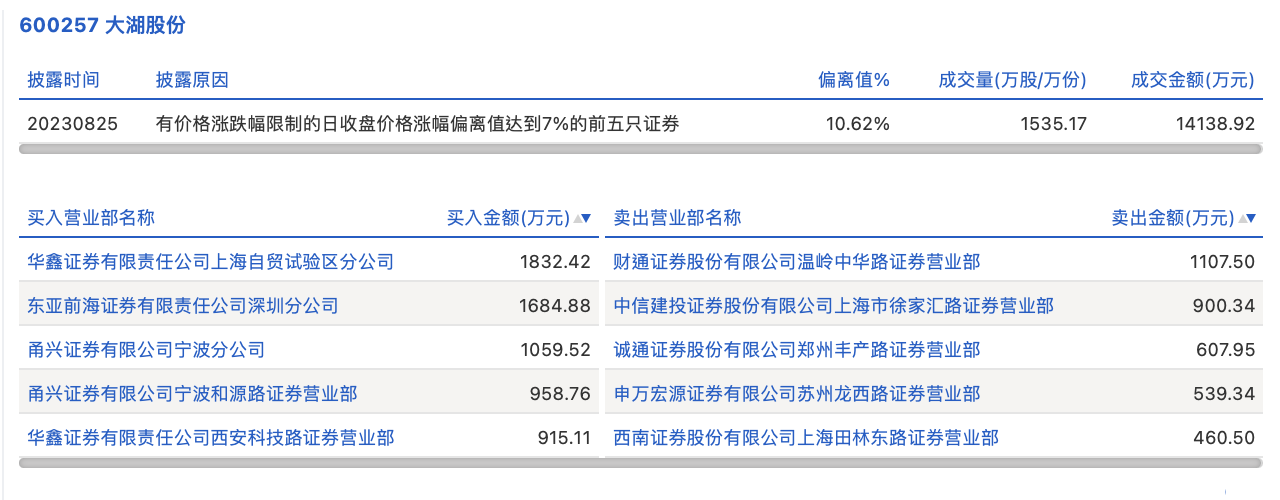 8月25日,大湖股份今日涨停,龙虎榜数据显示,上榜营业部席位全天成交1.01亿元,占当日总成交金额比例为71.2%。其中,买入金额为6450.68万元,卖出金额为3615.63万元,合计净买入2835.05万元。
