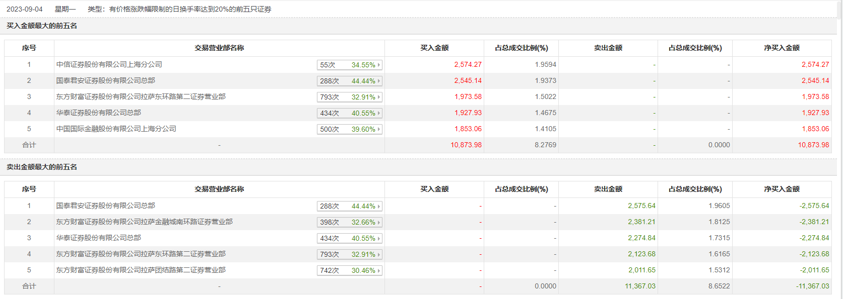 具体来看,中信证券上海分公司、国泰君安证券总部分别买入2574.27万元、2545.14万元;国泰君安证券总部、东方财富证券拉萨金融城南环路证券营业部分别卖出2575.64万元、2381.21万元。