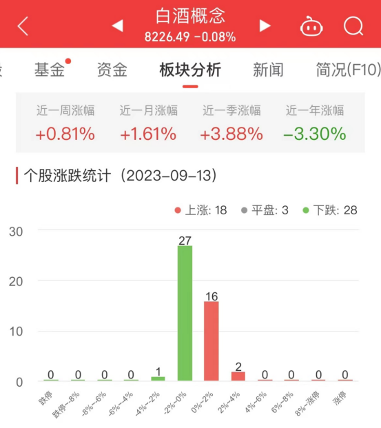 中国经济网北京9月13日讯今日,白酒概念板块整体跌幅0.08%,其中18只股票上涨,3只股票平盘,28只股票下跌。