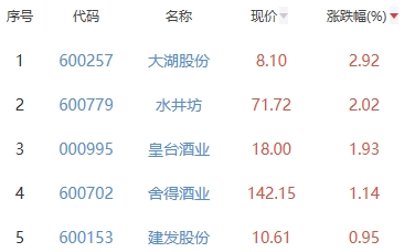 其中,大湖股份、水井坊、皇台酒业、舍得酒业、建发股份位列板块涨幅前五位,涨幅分别为2.92%、2.02%、1.93%、1.14%、0.95%。