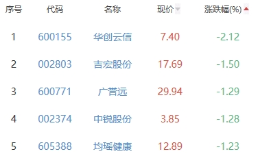 华创云信、吉宏股份、广誉远、中锐股份、均瑶健康位列涨幅榜后五位,涨幅分别为-2.12%、-1.50%、-1.29%、-1.28%、-1.23%。