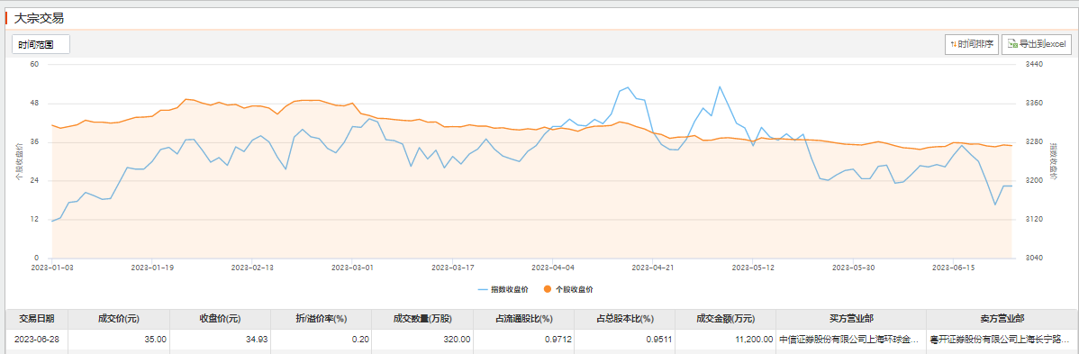 6月28日大宗交易成交320万股,成交额1.12亿元,占当日总成交额的61.37%,成交价35元,较市场收盘价34.93元溢价0.2%。