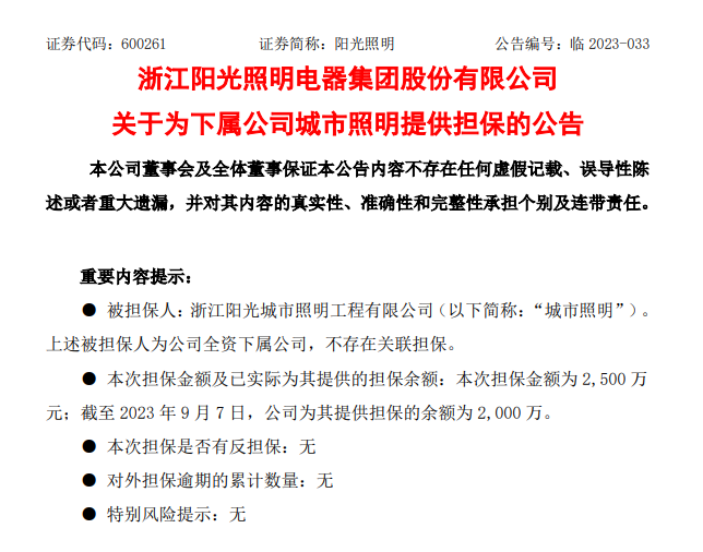 财经网讯 9月7日,阳光照明发布关于为下属公司城市照明提供担保的公告。