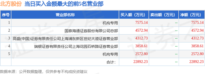 10月23日北方股份(600262)龙虎榜数据:机构净买入1.01亿元
