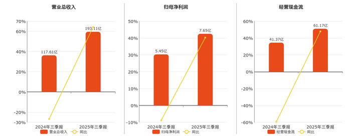 公司营业总收入为193.11亿元,在已披露的同业公司中排名第12,较去年同报告期营业总收入增加75.50亿元,同比较去年同期上涨64.20%。归母净利润为7.65亿元,在已披露的同业公司中排名第11,较去年同报告期归母净利润增加2.19亿元,同比较去年同期上涨40.24%。经营活动现金净流入为61.17亿元,在已披露的同业公司中排名第4,较去年同报告期经营活动现金净流入增加19.80亿元,同比较去年同期上涨47.87%。