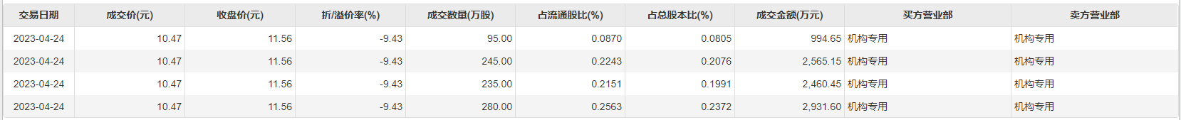 4月24日大宗交易成交855万股,成交额8951.85万元,占当日总成交额的13.95%,成交价10.47元,较市场收盘价11.56元折价9.43%。