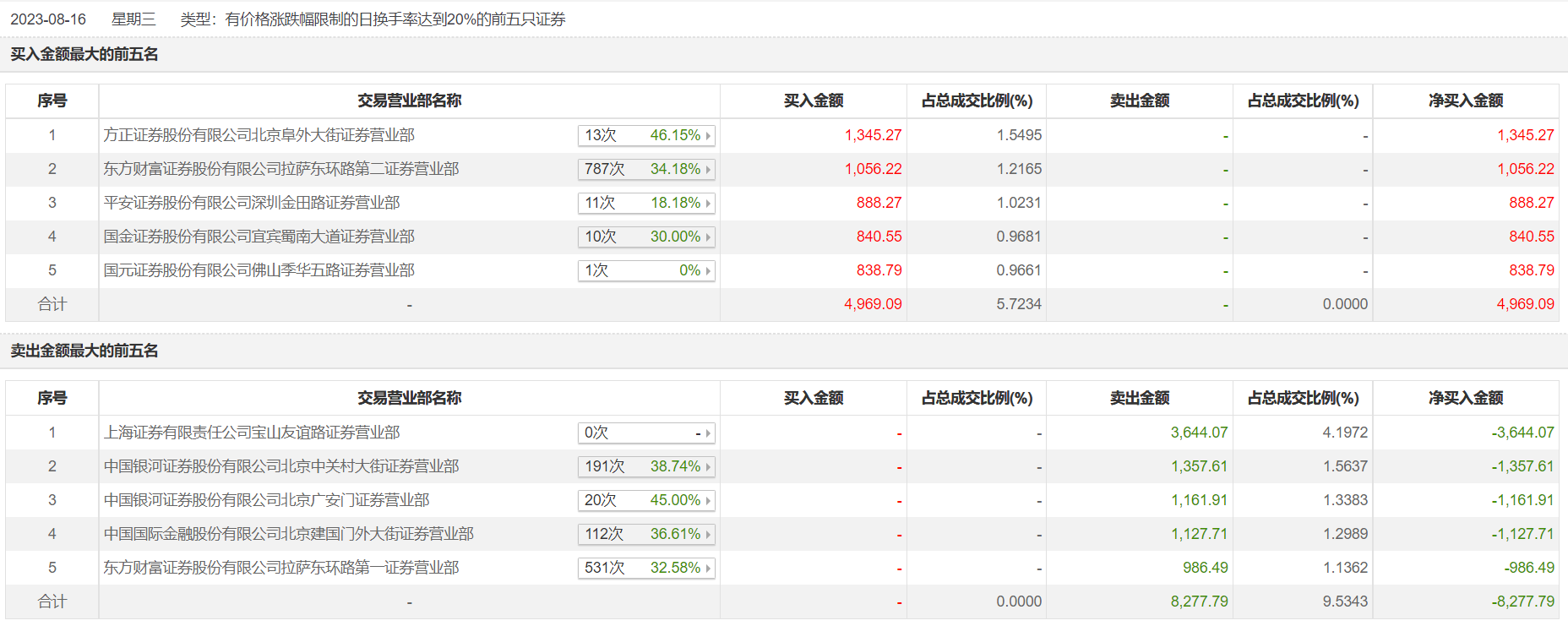 具体来看,方正证券北京阜外大街证券营业部、东方财富证券拉萨东环路第二证券营业部分别买入1345.27万元、1056.22万元;上海证券宝山友谊路证券营业部、中国银河证券北京中关村大街证券营业部分别卖出3644.07万元、1357.61万元。