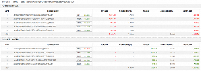 具体来看,方正证券北京阜外大街证券营业部、东方财富证券拉萨东环路第二证券营业部分别卖出1630.26万元、1026.20万元;招商证券深圳蛇口工业三路证券营业部、东方财富证券拉萨东环路第二证券营业部分别买入1281.03万元、1091.34万元。