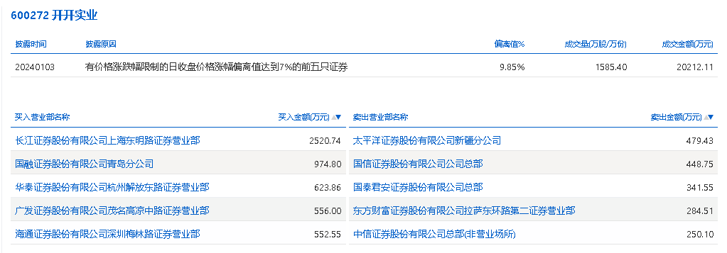 1月3日,开开实业今日涨停,全天换手率达9.91%,振幅达10.7%。龙虎榜数据显示,营业部席位合计净买入3423.61万元。其中,长江证券上海东明路证券营业部、国融证券青岛分公司分别买入2520.74万元、974.80万元;太平洋证券新疆分公司、国信证券公司总部分别卖出479.43万元、448.75万元。