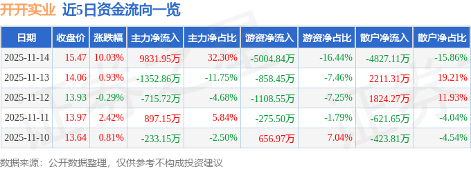 11月14日的资金流向数据方面,主力资金净流入9831.95万元,占总成交额32.3%,游资资金净流出5004.84万元,占总成交额16.44%,散户资金净流出4827.11万元,占总成交额15.86%。
