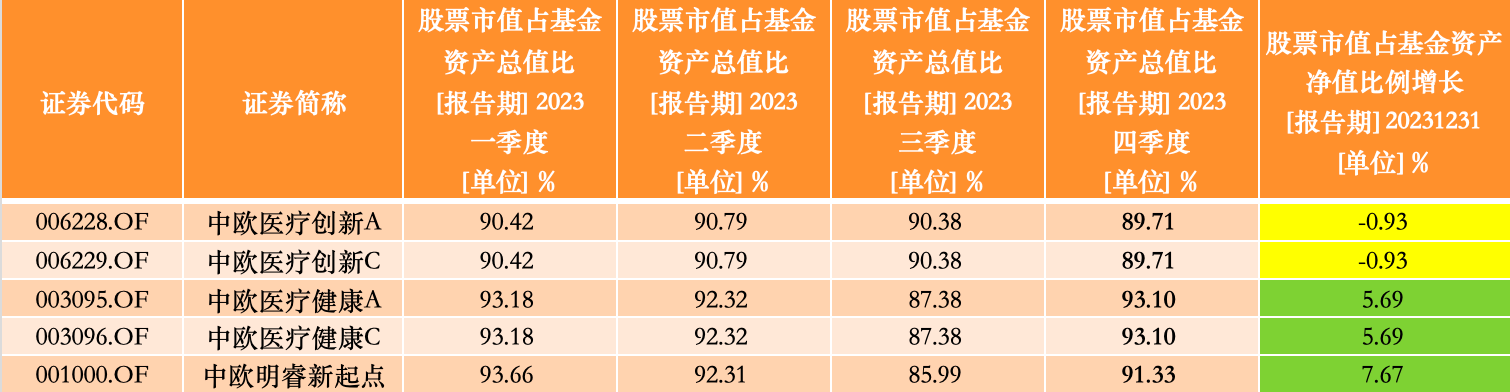 整体来看,在2023年四季度,中欧医疗健康与中欧明睿新起点的基金仓位重新回归到90%,依次为93.10%、91.33%。与之相对的是,葛兰在2023年四季度小幅度下移了中欧医疗创新的股票仓位,降仓幅度为0.93%。