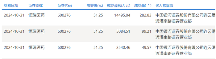 恒瑞医药今日大宗交易溢价成交431.61万股,成交额2.21亿元