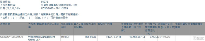 恒瑞医药(01276.HK)获Wellington Management Group LLP增持85.56万股