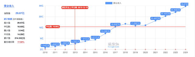 因为尿毒清是独家品种,终端的表现又非常给力,所以康臣药业这些年的业绩基本一直保持着稳定的增速,过去十多年营收的复合增速竟然有17.68%,就靠一款中成药,这其实是一件非常不可思议的事情,这个情况也几乎只会在中药、白酒等非常古老的行业看到。