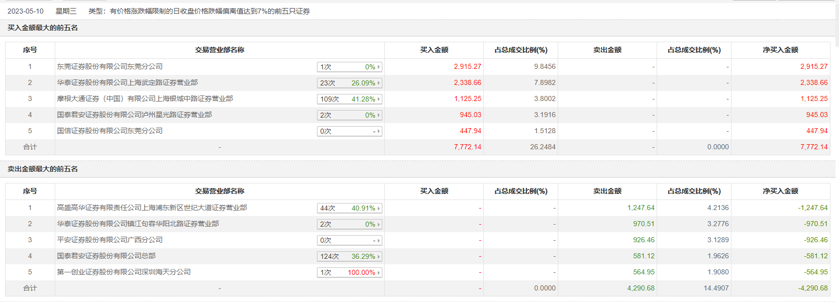 具体来看,高盛高华证券上海浦东新区世纪大道证券营业部、华泰证券镇江句容华阳北路证券营业部分别卖出1247.64万元、970.51万元;东莞证券东莞分公司、华泰证券上海武定路证券营业部分别买入2915.27万元、2338.66万元。